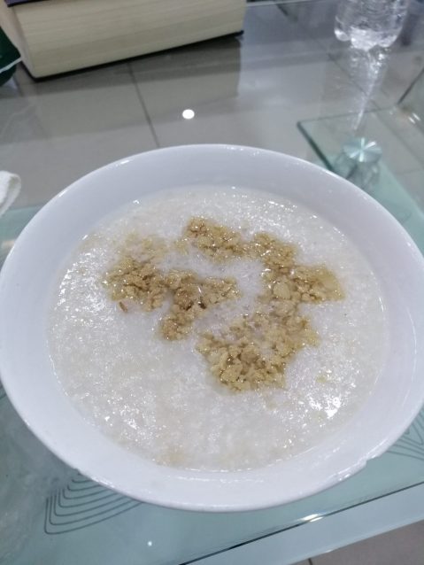 Keskiviikkona heti alkuun minulle työnnettiin eteen kupillinen riisivelliä. Puuroksi sitä nimitettiin, mutta se on ihan sileää, vain muutamia jyväsattumia joukossa. Jokainen, joka on joskus voinut pahoin, tietää, ettei oksentelun jälkeen eikä etenkään kuumeessa tee mieli syödä mitään. Koska tuekseni oli saapunut toimistolta kokonaista neljä ihmistä, joista etenkin Tonin assistentti otti asiakseen saada minut jälleen elävien kirjoihin, ja jotka kaikki vaativat että syön, nielin pakolla muutaman lusikallisen velliä. Ei se oikeastaan hullumpaa ollut, mutta kun ei vain mennyt mikään ruoka alas.