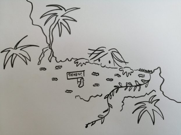 Niks – sitäpä ei ollutkaan taskuissa. Kaivoin ja kaivoin, kävin läpi repun ja kaikki mahdolliset ja mahdottomat paikat. Ei ole. Even kysymykseen ”Missä se voi olla?” osoitin vain epätoivoisen kyynisesti metsää. Kai avain on sitten tippunut taskusta ottaessani esiin kameraa. Vielä viimeinen epätoivoinen katsahdus pyörään ja…