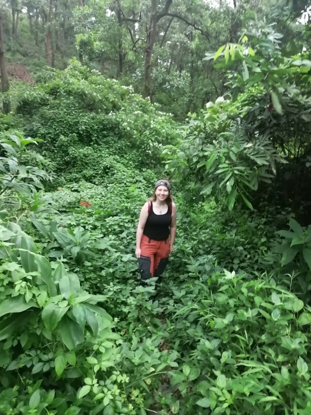 Lopulta sää kirkastui ja jatkoimme kiipeämistä. Ville oli ollut vuorella aiemminkin, mutta reitti oli lähes kadonnut rehevän kasvillisuuden alle. Enimmäkseen kulku kävi portaita, välillä polkua ja toisinaan piti vain kiivetä kallioseinämää ylös. Sain kulkea ensimmäisenä pitkien lahkeideni ansiosta ja mietiskelin, mahtavatko käsieni vieressä kalliolla vilistelevät karvamadot (niitä oli tuhansittain) olla myrkyllisiä.