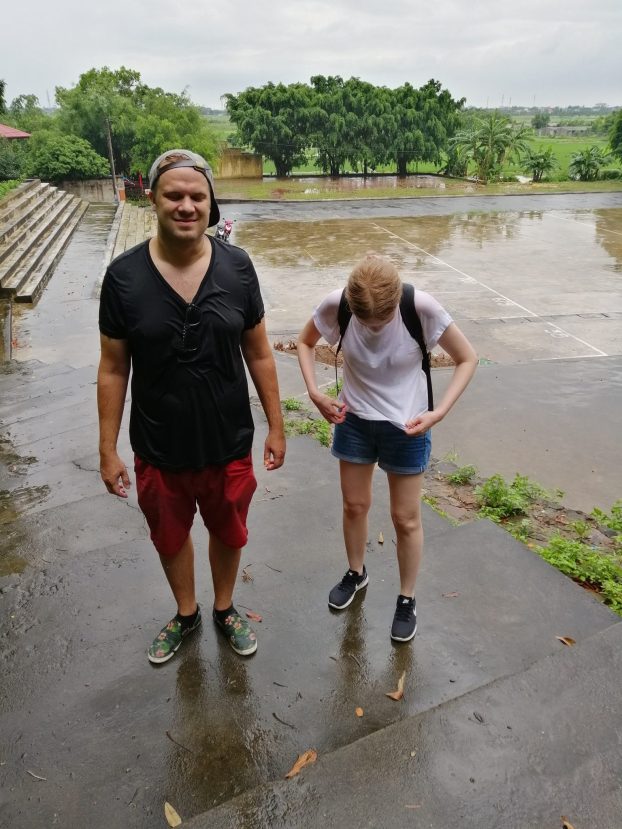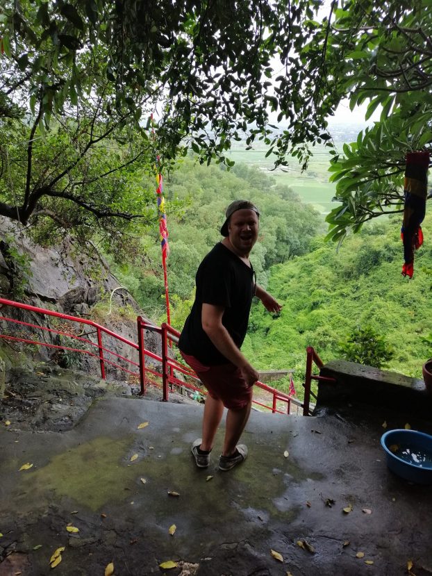 Palatessamme alaspäin saimme todella varoa askeliamme. Kivet olivat sateesta liukkaita, osa niistä liikkui jalkojen ja käsien alla ja välillä vastassa oli äkkijyrkkä pudotus, jos ei osannut kääntyä oikein. Onneksi olen muksusta asti kiivennyt kaikille mahdollisille kiville ja kallioille, joten askelmien tunnusteleminen oli tuttua. Matkalla poikkesimme vielä katsomassa vuoren toiseen rinteeseen rakenteilla olevaa temppelialuetta – ja silloin alkoi taas sataa. Nyt emme juosseet, mihinpä olisimmekaan kiiruhtaneet, kun sade tällä kertaa ei näyttänyt mitään loppumisen merkkejä. Kävelimme rauhassa kiviportaat alas kentälle. Olin jättäytynyt jälkeen tutkiessani temppelialuetta, ja katsellessani ympärilleni Vietnamin metsää, vuorenrinnettä ja lepakon kokoisia perhosia, hymyilin itsekseni ja tuhannennen kerran totesin itselleni ”olet sinä aika likka”.