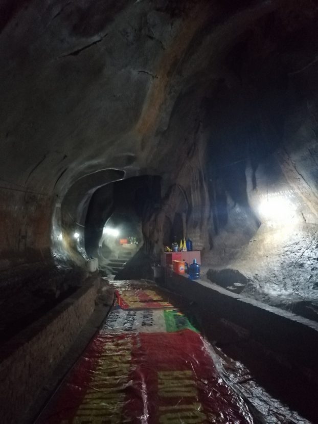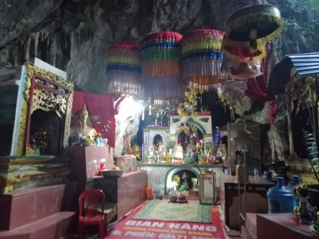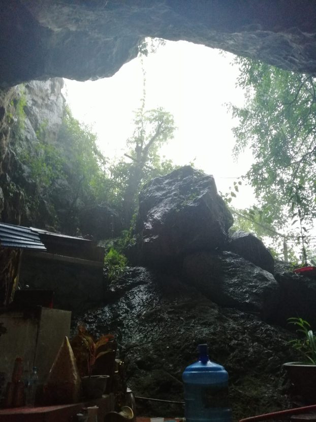 Ja olihan se luola! Luola jatkui ja jatkui vuoren uumeniin, ja pitkin luolastoa oli rakennettu alttareita. Paikalla oli nainen, jonka työtä on ilmeisesti opastaa ja pitää huolta alttareista. Otimme suuaukolla kengät pois ja lähdimme kurkkimaan tunneleita, tosin vesisateella luolan muovimatoilla suojattu lattia oli niin kurassa, että lopulta sukkasillaan kulkiessamme luovuimme leikistä. Istuimme alttarin ääressä, katselimme naisen suorittamia rituaaleja, kuuntelimme hänen kissansa vienoa nau’untaa luolan katonrajasta ja bongasimme sammakoita. Sade rummutti.