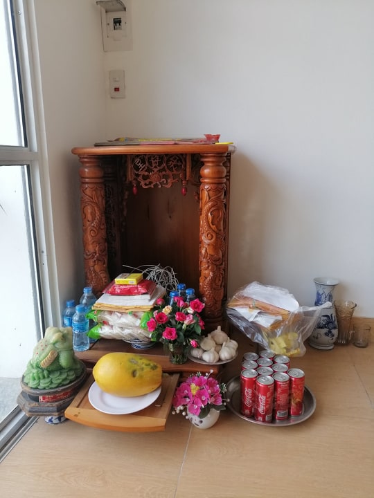 Jokaisessa kodissa, liiketilassa, koulussa ja laitoksessa on alttari, johon tuodaan herkkuja lunaarisen kuun ensimmäisenä päivänä ja puolivälissä. Kun uudet laitetaan tilalle, vanhat voi syödä. Nämä alttarihuoneet saattavat olla melko isojakin, muuten tyhjiä tiloja, tai sitten alttari on vain koottu johonkin nurkkaan. Alttarien herkut uhrataan esi-isille, jotta nämä pitäisivät perheestä huolta.