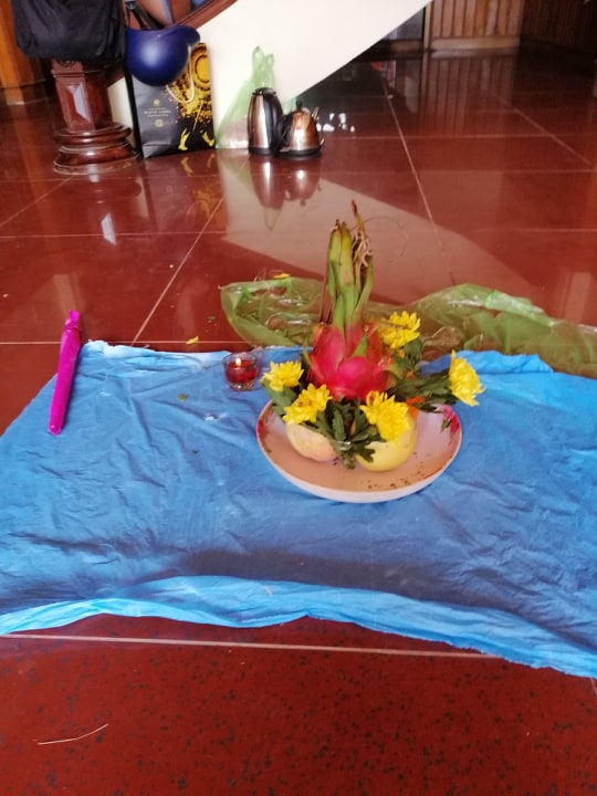 Tärkeille edesmenneille sukulaisille on jokaisessa talossa alttarihuoneessa kuva ja esimerkiksi suitsuketikun nenään palamaan laitettuja vainajan lempitupakoita. Kysyin, mitä alttarille tapahtuu, kun perhe muuttaa pois. Alttari voidaan kuulemma siirtää. Sitten mietin, miten vainajan henki löytää uuden alttarinsa, ihmisen kuollessa nimittäin tehdään monenlaista temppua, jotta henki ei jäisi kummittelemaan, mutta osaa palata vierailemaan vanhaan kotiinsa.