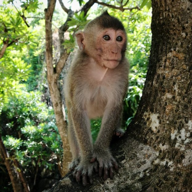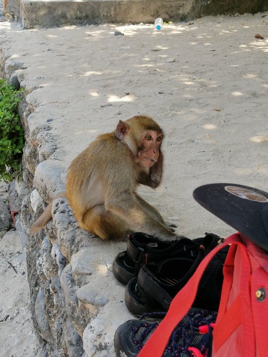 Saaren apinat tulevat kerjäämään turisteilta rannasta pähkinöitä ja muita herkkuja. Minulla ei pähkinöitä ollut, mutta yksi pikkuinen kiipesi selkääni pitkin olkapäälleni ja silitti kättäni. Apinoiden ihmismäisyys ei koskaan lakkaa hämmästyttämästä minua, pienet sormet olivat kuin pienen lapsen käsi. Ja pienet hampaat terävät kuin eskarilaisen naskalit pureutuessaan käteeni. Yhden apinan kanssa nimittäin tuli keskustelua tavaroideni omistusoikeudesta. Tyyppi puri ensin käteen minua ja hetken päästä erästä turistimiestä.