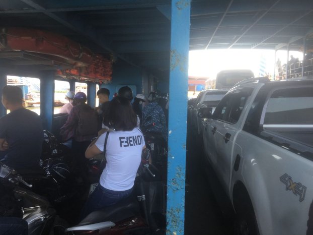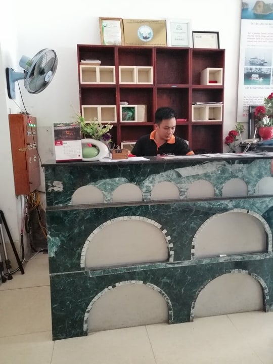 Autolautta kulkee saarelle puolen tunnin välein ja matka kestääkin juuri sen vajaan puolisen tuntia. Turistit matkustivat lähinnä lauttaan parkkeeratuilla busseilla, ja paikallisväestön joukosta penkkipaikat etsiessämme saimmekin menomatkalla poseerata yhdessä sun toisessakin kuvassa. On se niin ihmeellistä kun tällainen valkoinen kummituskin ja kaikkea. Cat Ba’lle päästessämme ajelimme koko saaren halki eteläkärkeen, josta olimme varanneet hotellihuoneen keskeltä kylää.
