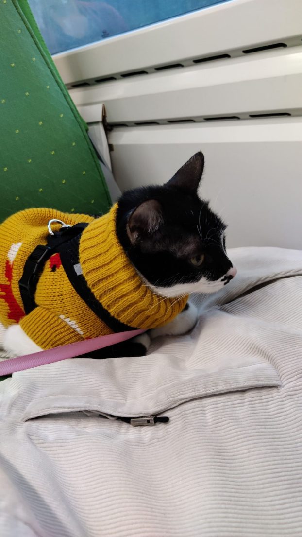 Sisu retkottaa jalkojeni päällä, sillä ei ole kiire mihinkään. Koiria pullisteleva junavaunu ei varsinaisesti houkuttele edes seikkailukissaa tutustumaan ympäristöönsä sen tarkemmin. Viereisen penkin surusilmäinen katselee kissamatkustajaa levollisesti, edemmän penkin suurikorvaiselta taas kannattaa ihan selvästi pysyä piilossa. Polvien päällä on hyvä, samoin aivan penkin nurkassa ikkunan alla.