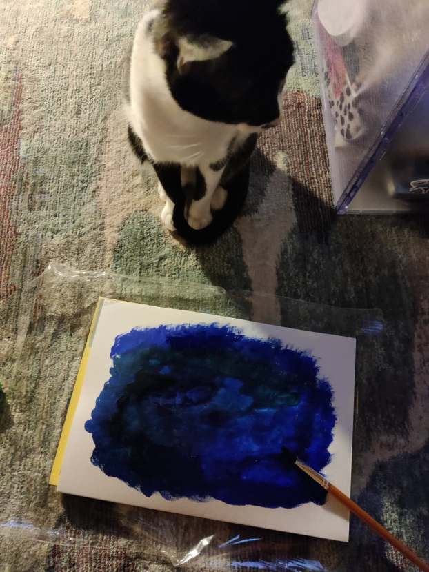 Sivellin pyyhkäisee paperia, voimakas keltainen leviää tumman sinisen keskelle. Lisää väriä, muodon hakua. Kissa vieressä kallistelee päätään, yrittää ensin työntää käpälänsä maaliin, sitten tavoitella siveltimen vartta hampaillaan. Se ohjataan lempeästi tutustumaan hienoon postilähetyksestä tyhjentyneeseen paperipussiin, minne onkin hyvä asettua seurailemaan tätä erikoista toimitusta lattialla. Joka puolella on pieniä värituubeja, siveltimiä, pestyjen viilipurkkien päälle puristettuja värejä. Ja kaiken keskellä yksi kuumeisesti valaan hahmoa sormillaan tapaileva ihminen – epäergonomisessa asennossa, rikkinäisessä paidassa, hiukset hajallaan ja kimallus silmissään.