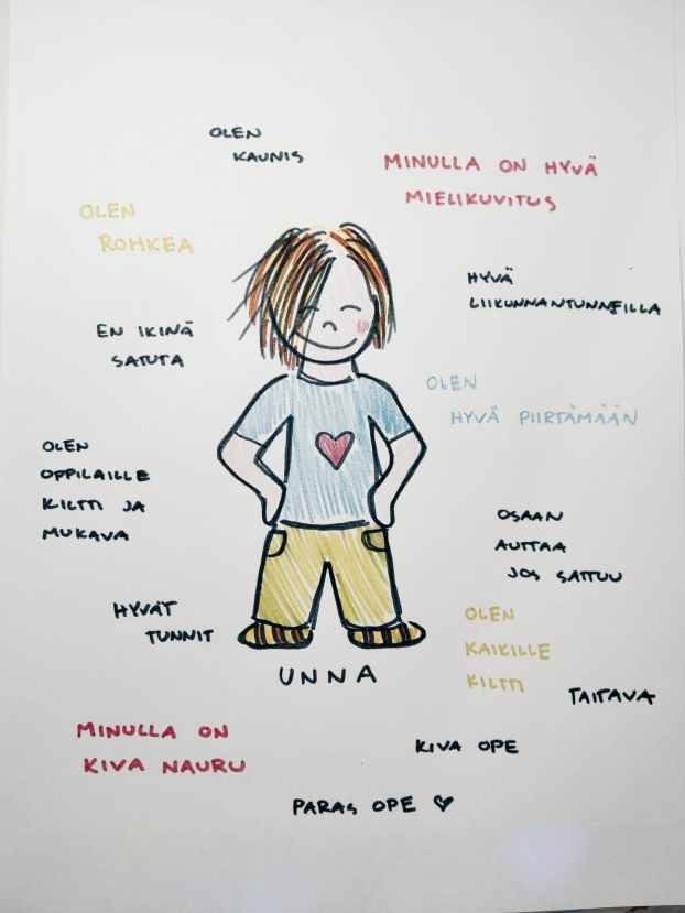 Annoin tämän tehtävän tänään oppilailleni ekaluokassa. Ensin piti piirtää oma kuva, sen jälkeen kirjoittaa kuvan ympärille ne kolme asiaa. Eräskin tyttö pohti pitkään ja tuli sitten luokseni tyjän paperin kanssa: En minä keksi yhtään. Otin tytön kainaloon ja kysyin missä hän on hyvä, mutta hän ei osannut sanoa. Kysyin mistä hän pitää kun katsoo peiliin, mutta siihenkään en saanut yhtään vastausta.
